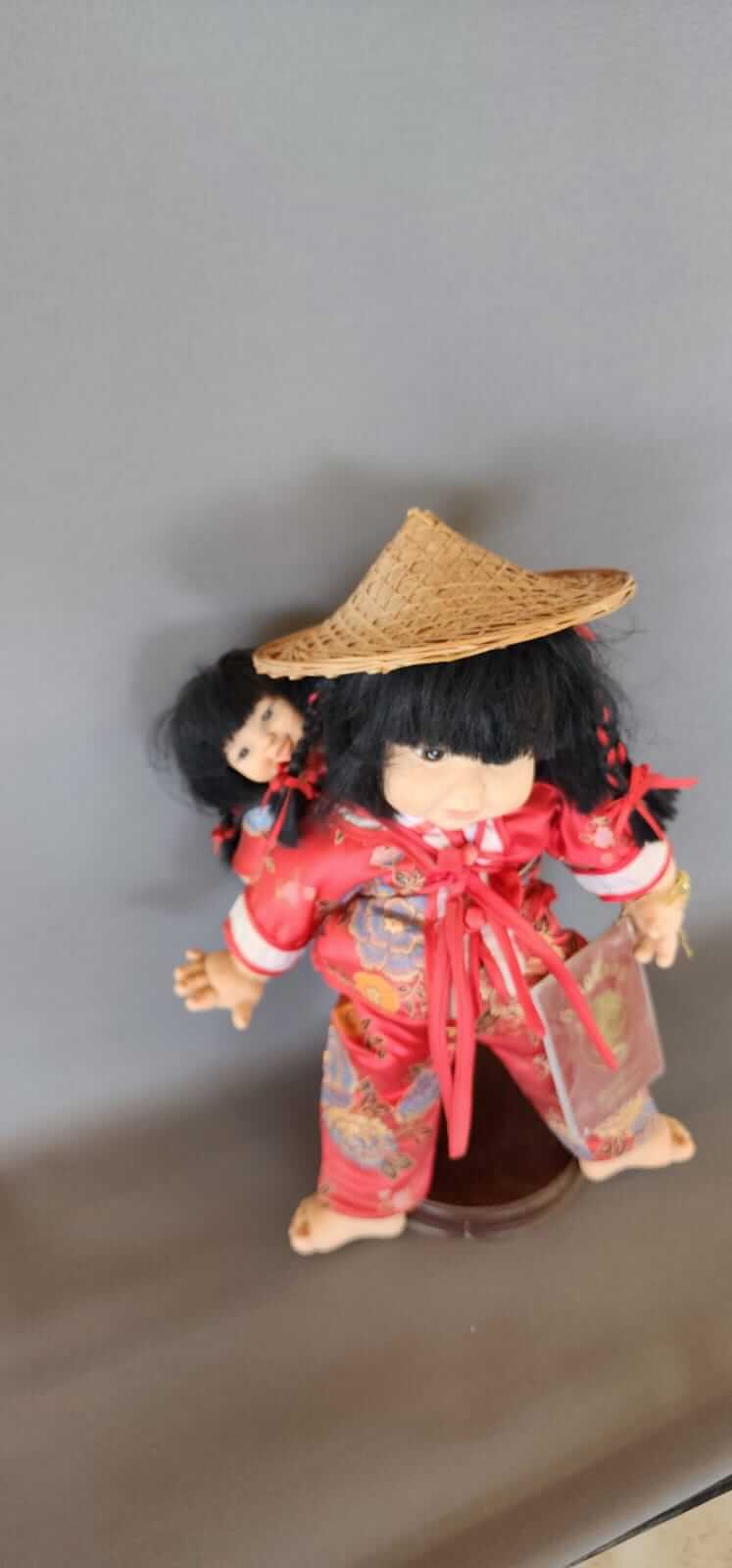 הבובה לובשת בגד סאטן בגווני אדום, עם הדפסי פרחים עשירים, ולראשה כובע קש קטן בעיצוב מסורתי.